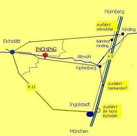 A 8 Stuttgart-München Ausfahrt Augsburg -Ost >Dasing > Neuburg/Donau > Eichstätt >Altmühltal >>Kipfenberg, ca.2 km hinter Pfünz (Brücke) Abzweig links >Inching